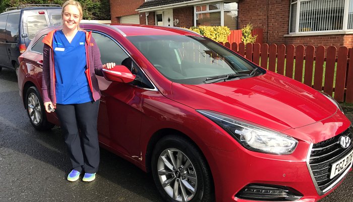 based at Muckamore Abbey Hospital, Antrim pictured with her new Hyundai i40 Tourer. Maureen wrote: I would like to pass on my thanks to you and your entire team, from the excellent service in helping me pick my dream car from yourself and Winston, to the test drive at Cannon Motors with Gibson and not forgetting the very professional delivery service from one of your staff. Myself and my husband love our car and couldn't fault it.