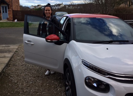 from Millisle, County Down taking delivery of her new Citroen C3 Feel PureTech in polar white with contrasting red roof