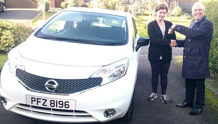 from Bangor receiving the keys to her new 2014 Nissan Note Visia 1.2 80PS from Winston Stewart of Staff Services