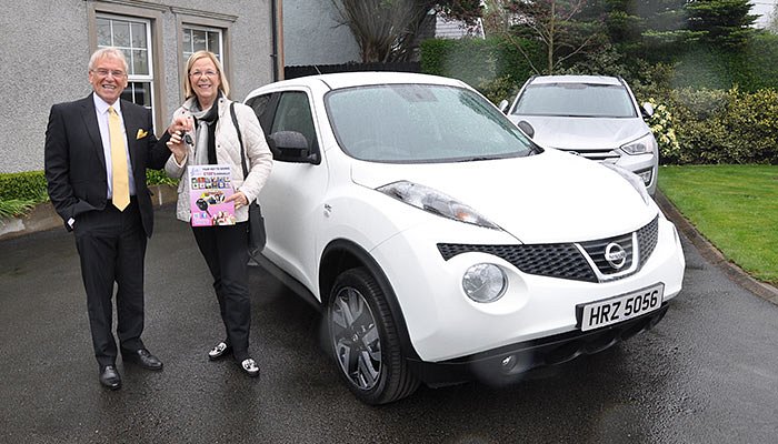 Deputy Director at Antrim Area Hospital takes delivery of het new Nissan Juke N-Tec 1.6 117PS in Artic white from Winston Stewart of Staff Services